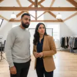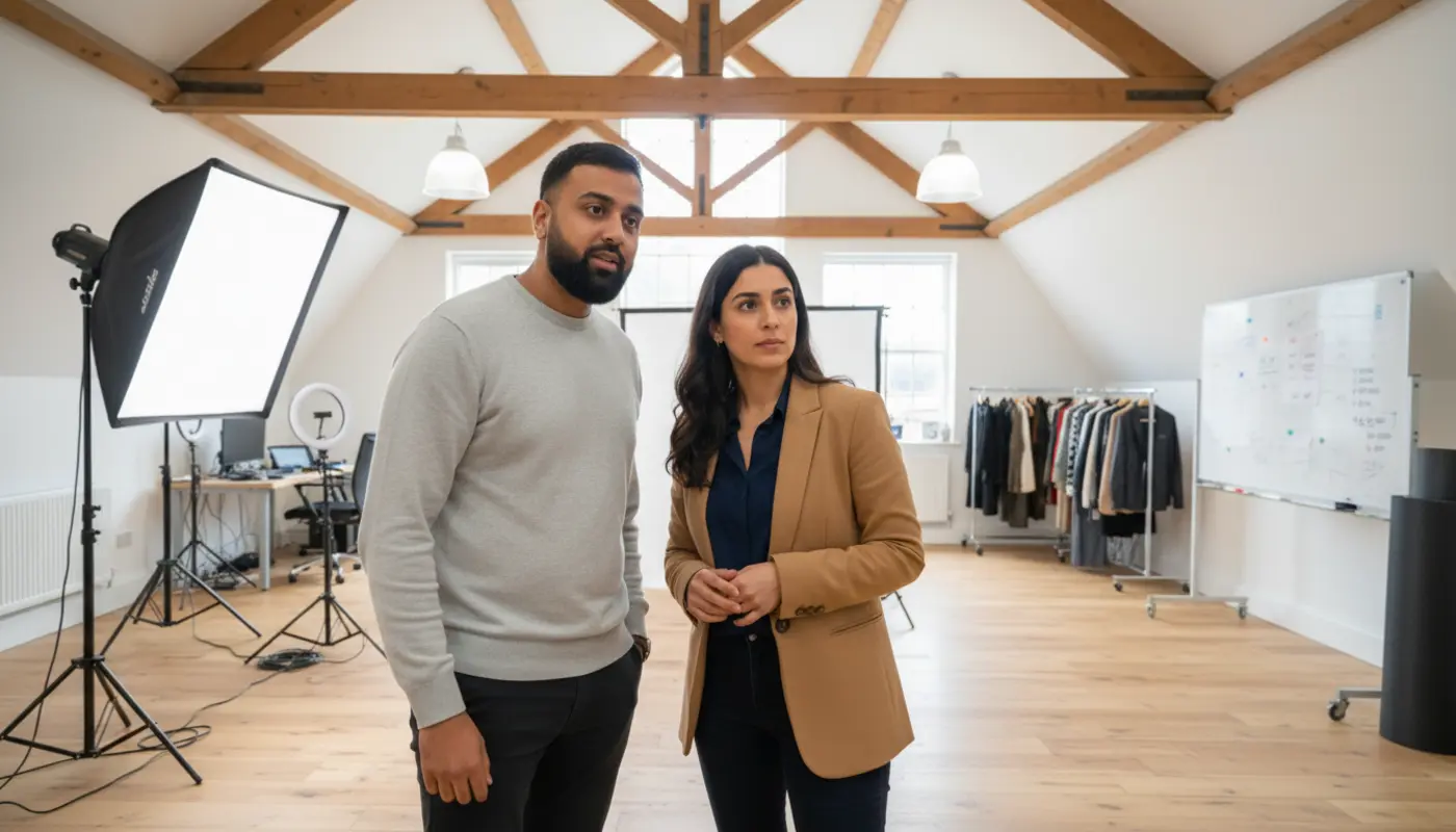 Adam and Sara walking outside a UK office building discussing Adobe AI.